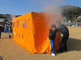 まずは、煙道体験です。ハンカチで鼻と口を覆って煙の充満するテントを通っていきます。体を低くして通り抜けるとよいことを体感しました。