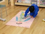 朝の時間、1年生は等身大の自分の絵に自分のよさを書き込み発信する掲示物をつくっています。教室脇の壁には、みんなの作品が貼りだされていて圧巻です。