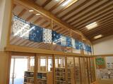 昇降口には、先月みんなで作った藍染め作品がひらめいて、目を喜ばせてくれています。