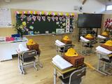 1年教室では、一つ一つの机に置かれたランドセルや帽子、たくさんの配付物に抜けがないか、掲示物はきれいに貼ってあるかなどなど、準備とチェックをしていきました。