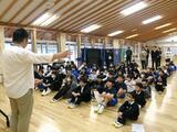 交通安全の話の後、後期課程の生徒が「きららホール」に残り、部活動についての「集会」を行いました。本校には、吹奏楽部と卓球部、さらに期間限定の陸上部の3つの部があります。始めに校長から顧問の発表がありました。子どもたちの反応はというと、「予想通り!」という感じ。その後、部活動担当から地域展開に伴う部活動の変更点や県北陸上についての説明がありました。