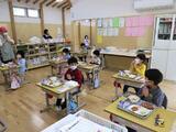 きちんと白衣を着て、先生の話を聞いたり2年生のお兄さんお姉さんに教えてもらったりしながら、配膳をすることができました。少し緊張した様子もありましたが、「お願いします」「ありがとう」といった言葉が自然に交わされていて、とっても素敵でした。